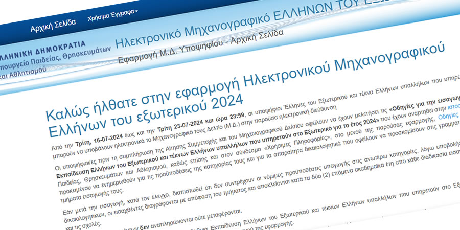 16-07-24 Υποβολή ηλεκτρονικής αίτησης συμμετοχής στις εξετάσεις και μηχανογραφικού Δελτίου για την εισαγωγή Ελλήνων του εξωτερικού στην Τριτοβάθμια Εκπαίδευση έτους 2024 Από το Υπουργείο Παιδείας, Θρησκευμάτων και Αθλητισμού ανακοινώνεται ότι οι Έλληνες του εξωτερικού, που έχουν τις προϋποθέσεις υπαγωγής στις ειδικές κατηγορίες υποψηφίων για εισαγωγή στην Τριτοβάθμια Εκπαίδευση, καλούνται να υποβάλουν ηλεκτρονικά (μέσω διαδικτύου) αίτηση …
